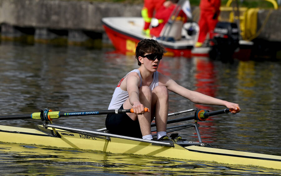 Auch Leander Spring startete in diesem Block. Er belegte im Leichtgewichts-Einer den fünften Platz und konnte damit in seinem ersten B-Junioren-Jahr bereits neun Konkurrenten hinter sich lassen.