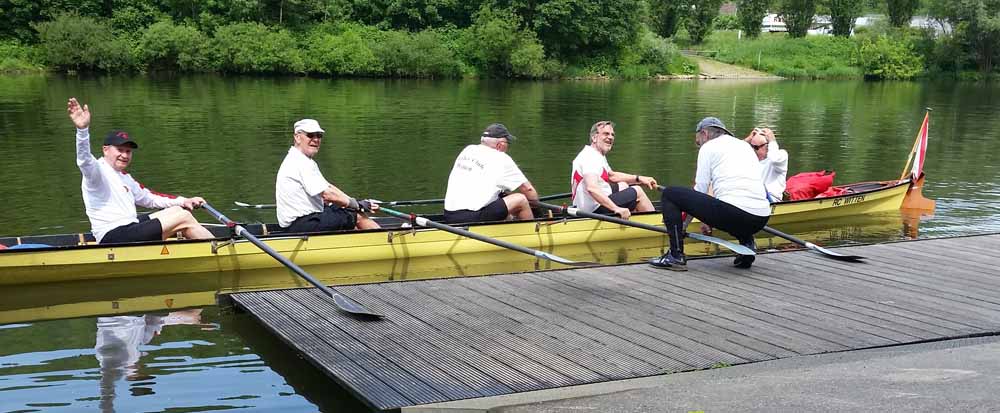 Anlegen, Abriggern und verladen war jetzt eins, zwei war dann das abschließende gemeinsame Essen auf der Terrasse der Rudergesellschaft. Schön war’s mal wieder und die Heimfahrt war auch staufrei. Dieter, hast alles prima gemanaged. Das am Vorabend überreichte Weinpaket hast Du Dir redlich verdient. Was täten wir doch ohne Dich?