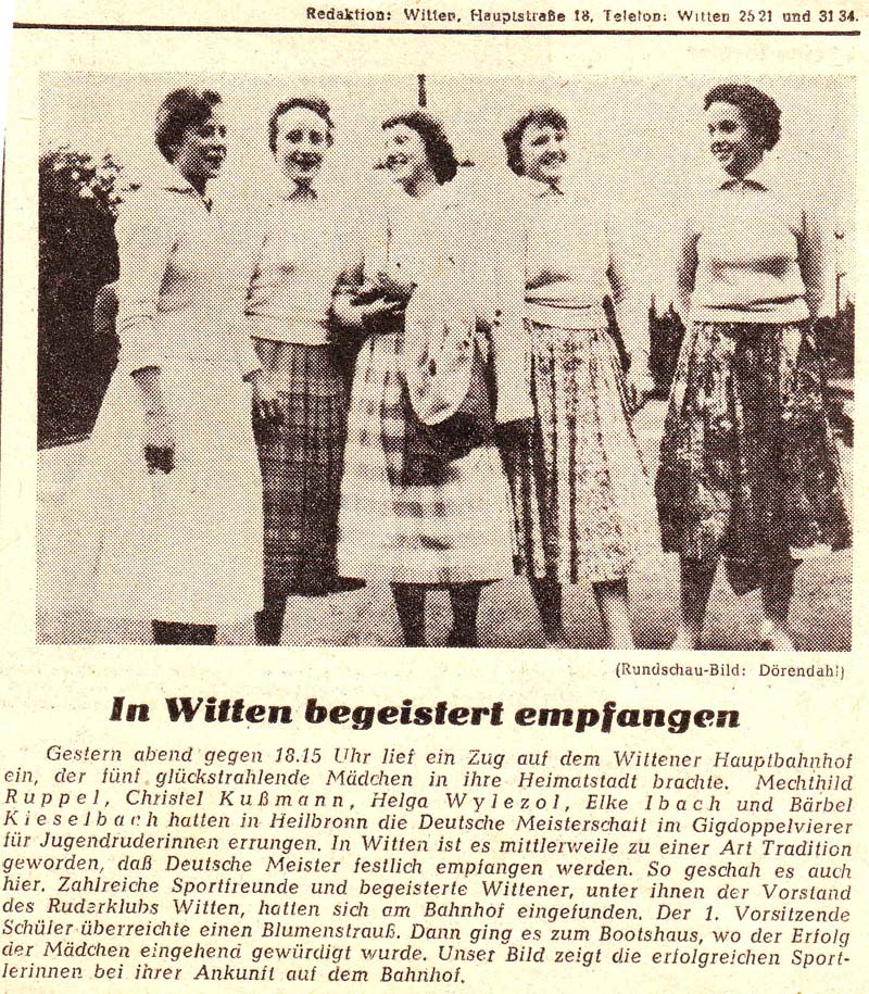 | 1956 | 5 RCW-Juniorinnen wurden Deutsche Meister im Gig-Vierer mit Steuerfrau. Mechthild Ruppel, Christel Kußmann, Helga Wylezol, Elke Ibach und Bärbel Kieselbach ( heute bekannt als Bärbel Hebestreit) wurden in Witten begeistert empfangen. |