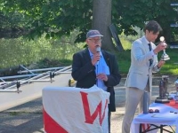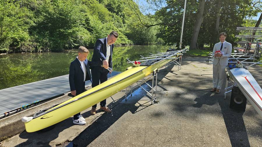 Ein weiterer Gänsehautmoment folgte mit der Bootstaufe des zweiten Vierers für den Leichtgewichtsbereich auf den Namen „Ruhrgold“ durch den ehemaligen Clubvorsitzenden Maik Swienty zusammen mit seinem Sohn. Maik wohnt mittlerweile in der Nähe von Kiel, doch seine Worte machten deutlich: „Es fühlt sich wie nach Hause kommen an wieder am RCW zu sein.“ Er zeigte sich tief beeindruckt vom gepflegten Zustand des Clubgeländes und sprach Marcel seinen herzlichen Dank dafür aus, das Amt vor einigen Jahren in einer schwierigen Zeit übernommen und mit Bravour weitergeführt zu haben. Lukas Albrecht, Jan Lohmeyer, Christian Solomov und Maximilian Händel ruderten das frisch getaufte Boot als Erste.