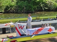 Schließlich folgte die Taufe des leichten Doppelzweiers durch Fabienne Andree, die bereits zuvor für 25 Jahre Mitgliedschaft geehrt worden war. Mit einem Lächeln erinnerte Marcel van Delden an ihre sportlichen Erfolge im Skullbereich. Den ersten Schlag im neuen Boot „Phönix“ machten Lea-Sophie und Amelie Lehde, das talentierte Zwillingspaar des RCW.