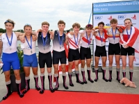 Im Junioren A Achter am Sonntag folgte dann die erhoffte Belohnung: Vom Start weg ruderte die Renngemeinschaft kraftvoll mit und positionierte sich zur Rennhälfte auf dem zweiten Platz. Diesen verteidigten sie mit großem Kampfgeist und fuhren souverän zur Silbermedaille – der verdiente Lohn für ein anstrengendes Wochenende.