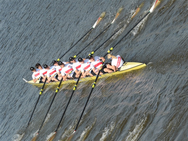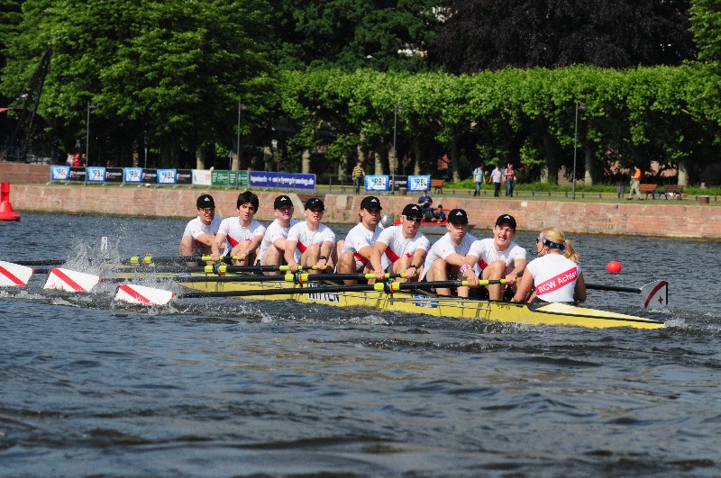 Nach dem Zeitlauf über die 350 Meter kurze Sprintstrecke im Zentrum Frankfurts belegte die Mannschaft von Training Henning Sandmann noch Platz 11. Im Achtelfinale mussten sich Simon Faissner, Maik Swienty, Denis Baumgart, Peter Zeller, Andy Herrmann, Sören Kunde, Christoph Schroeder, Thorsten Fingerle und Steuerfrau Fabienne Andree dann aber mit den Booten aus Pirna, Esslingen und dem Fledermausachter aus Dresden auseinandersetzen. Gegen alle drei Boote hatte der RCW-Achter das Nachsehen. Zwar kam die Mannschaft gut vom Start weg, viel nach den ersten Schlägen aber zunehmend auseinander. Ebenfalls Probleme bereiteten den Wittenern die schwierigen Bedingungen. Die sonst von einer meist spiegelglatten Ruhr verwöhnten Ruderer hatten auf dem Mai mit Wind und Wellen zu kämpfen. „Natürlich haben alle Boote keine guten Bedingungen gehabt, nur waren, wie schon im letzten Jahr, die verschiedenen Bahnen unterschiedlich betroffen. Da hatten wir leider einmal mehr etwas Pech, auch wenn das sicherlich nicht alleine den Ausschlag gegeben hat“, so Schlagmann Simon Faissner.