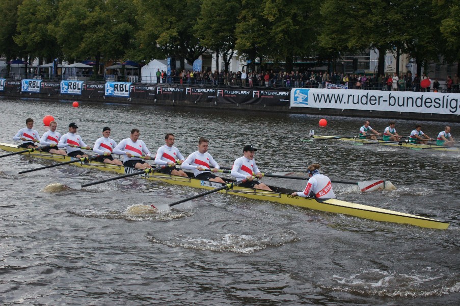 Für das Achtelfinale bedeutete das ein Duell mit dem starken Achter aus Dortmund. Bereits am Start fand der Wittener Achter dabei nicht richtig ins Rennen und musste das Dortmunder Boot ein Stück ziehen lassen. Den Rückstand konnten die Wittener dann bis zum Ziel nicht mehr aufholen. Aufgrund der Tatsache, dass auf der Binnenalster nur auf zwei Bahnen gerudert werden kann, bedeutete diese Niederlage im Achtelfinale, dass der RCW-Achter bereits aus dem Kampf um die ersten acht Plätze ausgeschieden war. Da außerdem in der zweiten Ruder-Bundesliga derzeit nur 14 Boote am Start sind, ergab der Modus des Renntages darüber hinaus, dass der RCW-Achter im Viertelfinale aussetzen und erst im Halbfinale wieder angreifen konnte. „Dadurch dass das KO-System mit 14 Booten nicht komplett aufgeht, ist das System bei zwei Regattabahnen bei uns in der zweiten Liga leider etwas komplizierter. Schade war natürlich für uns, dass wir nicht direkt im Anschluss an das Achtelfinale zeigen konnten, dass wir es besser können,“ so Trainer Sandmann.