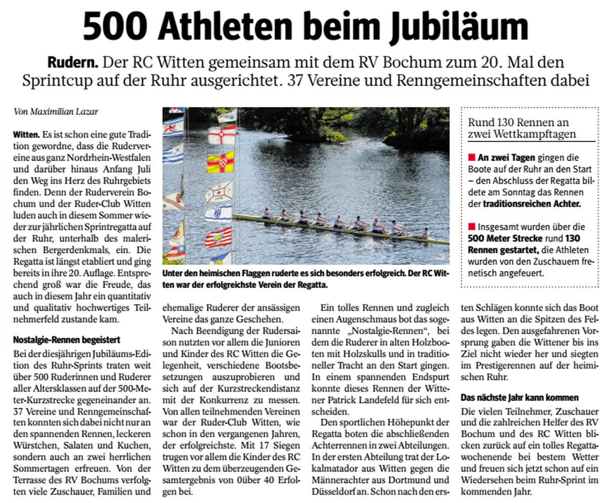 Makeloses Wetter und ein starkes Teilnehmerfeld waren eine gute Voraussetzung die Gemeinschaftsveranstaltung des RV Bochum und des RC Witten den 20. Ruhrsprint am 07. und 08. Juli zu einer erlebnisreichen Regatta zu gestalten.