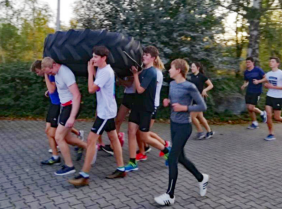 Als 6. Station musste mit einem Vorschlaghammer auf einen Treckerreifen gehämmert werden. Belastungsdauer 45 Sekunden. Nach jeder Station musste die Gruppe einen riesengroßen Treckerreifen 50 m hin und zurück tragen. Insgesamt 3 Runden.