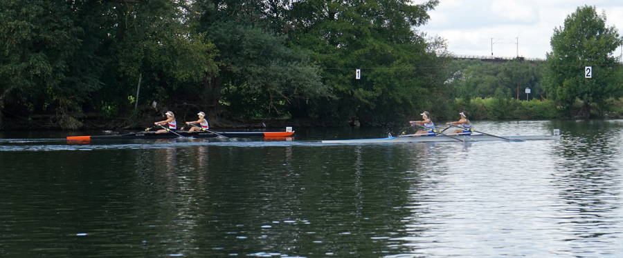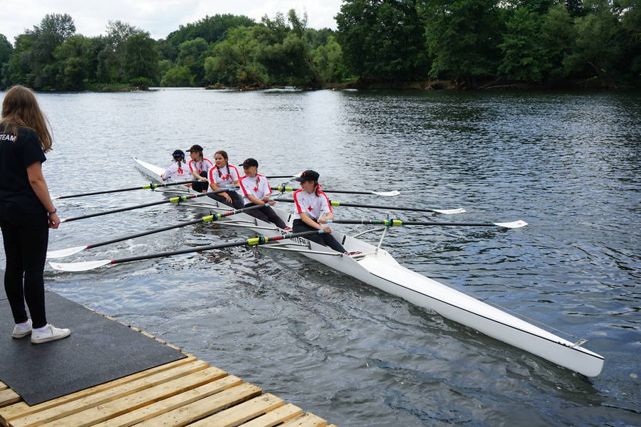 Die Novizinnen im Mädchen-Doppelvierer Amelie Sandmann, Julie Aurelia Spring, Liana Büttner, Milena Hermanowski und Steuerfrau Chiara Dmoch bewiesen ebenfalls ordentlich Biss. Trotz eines leichten Rückstandes nach der 3000 Meter Langstrecke konnten sie vor allem bei den Zusatzwettbewerben, die sie mit der maximalen Punktzahl absolvierten, ihre Trümpfe ausspielen. Auf der Kurzstrecke griffen sie die Spitze des Feldes an und ließen die starke Konkurrenz aus Mülheim sogar hinter sich. Nach der Hochrechnung aller Teilergebnisse belegten Amelie, Julie, Liana, Milena und Chiara den insgesamt dritten Platz.