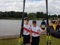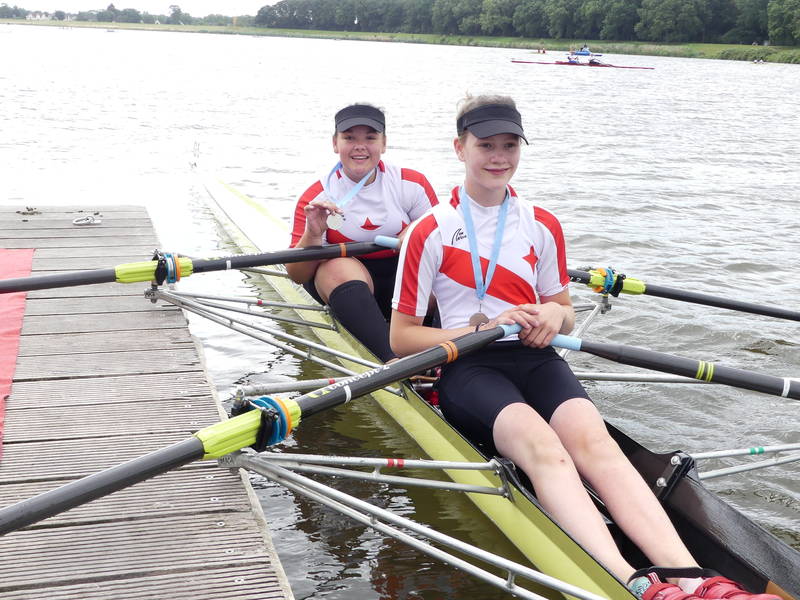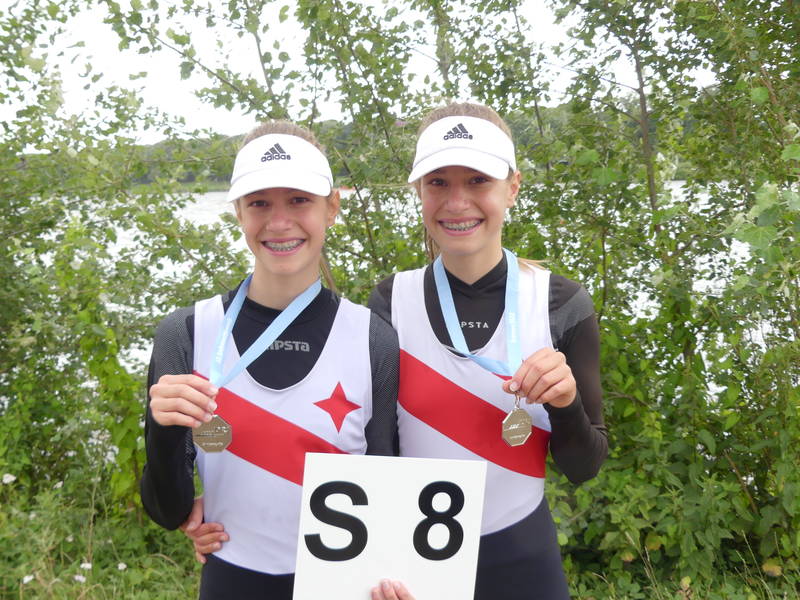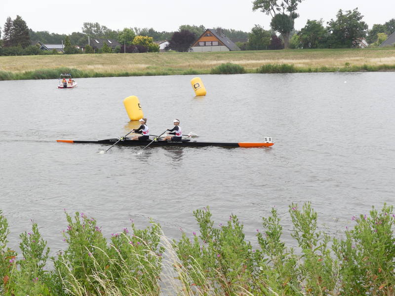 Amelie_Schlagposition_Lea-Sophie_Lehde_Siegersteg LandeswettbewerbDas Zwillingsduo Amelie und Lea-Sophie Lehde ging im Mädchen Leichtgewichtsdoppelzweier des Jahrgangs 2008 an den Start. Ihr Ziel, eine Medallie über Lang- und Kurzstrecke zu erreichen, erreichten die beiden Wittenerinnen. Dabei gewannen sie über die 3000 m Langstrecke die Silbermedallie hinter ihren Konkurrentinnen aus Lübeck, gegen die sich die Beiden schon bei einer Kinderregatta in Bremen noch geschlagen geben mussten. Im A-Finale konnten sie in einem beherzten Rennen diese Platzierung wiederholen und sich auch über die 1000 m über die Silbermedallie freuen. Zusätzlich gewannen die Beiden durch ihren 2. Platz über die Langstrecke eine Einladung des deutschen Ruderverbandes zu einem einwöchigen Trainingslehrgang an der Olympiaregattastrecke von 1972 in München.