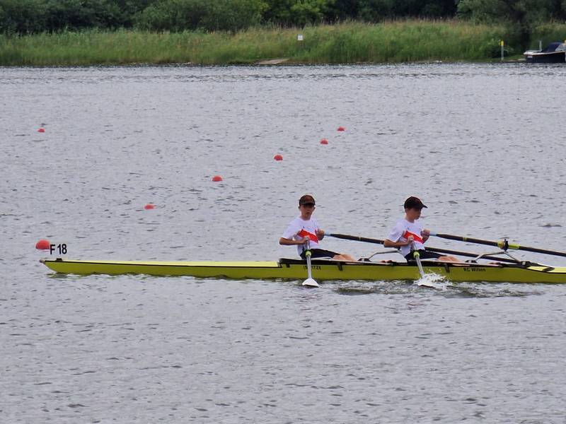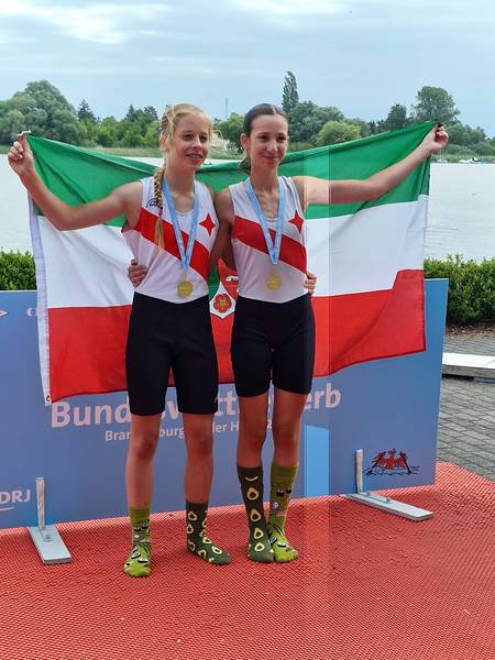 Melanie Solomov und Timea Ryll im Leichtgewichts-Mädchen-Zweier Jahrg. 2010 rudern zwar erst seit Anfang der Saison zusammen, hatten aber beim Landes-wettbewerb eine überragende Vorstellung geboten. Deshalb hatten die Trainer große Hoffnung bei insgesamt 17 Booten zumindest das A-Finale zu erreichen. Doch leider lief die Langstrecke gar nicht nach den Vorstellungen und so reichte es am Ende nur zu Platz 8 und das B-Finale. Hier hatten sie ihre Form wiedergefunden und siegten deutlich mit einer Zeit, die im A-Finale zu Platz 1 oder 2 gereicht hätte.