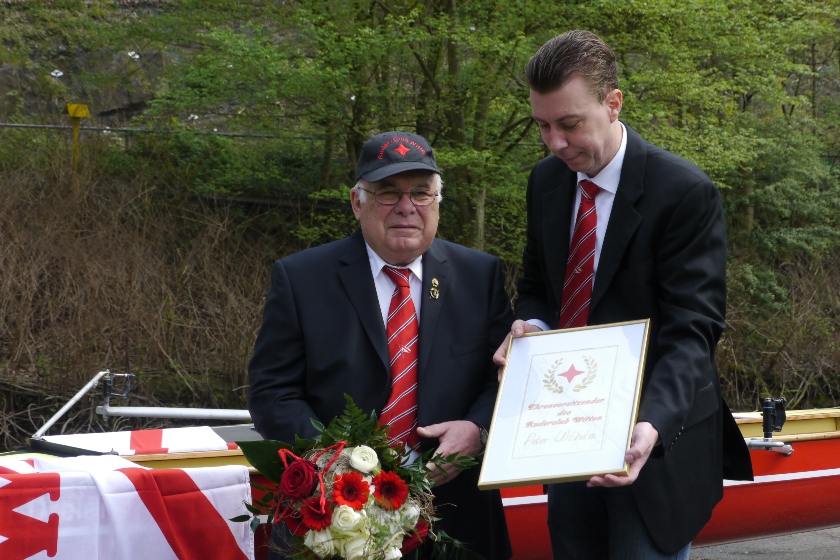 Seit nun mehr 60 Jahren ist Peter Wilhelm Mitglied des RCW. Pitze, der bis zum vergangenen Jahr die Geschicke unseres Clubs 18 Jahre als Vorsitzender geleitet hat, wurde allerdings nicht nur für seine außergewöhnliche Vereinstreue geehrt. Maik Swienty konnte als besonderen Höhepunkt des Anruderns verkünden, dass der erweiterte Vorstand gemäß dem Wunsch der Mitgliederversammlung 2011 seinen Vorgänger offiziell zum Ehrenvorsitzenden des Ruder-Club Witten ernannt hat. Lang anhaltender Applaus begleitet die Übergabe der Ehrenurkunde an den sichtlich gerührten Pitze, der sich für die große Unterstützung in all den Jahren bedankte.