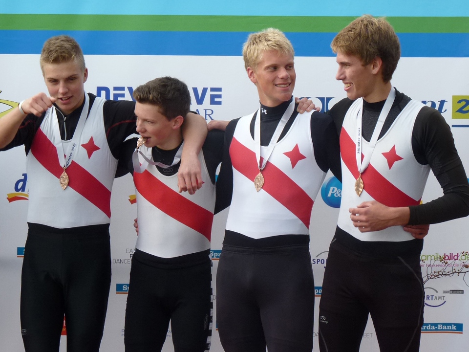Eine klasse Leistung zeigten die B-Junioren Philipp Dahm, Lukas Föbinger, Benedikt Pernack und Jacob Raillon im Doppelvierer der U17-Klasse. Bereits am Samstag gelangen dem Quartett unter dem Kommando von Steuermann Paul Rodewig ein ungefährdeter Vorlaufsieg und damit die Qualifikation für das Finale auf dem Münsteraner Aasee. Dort warteten mit Essen und Kassel zwei starke Gegner auf das Wittener Team, das mit Elena Dahm als Steuerfrau an den Start ging. Im Finale ließen die RCW-Ruderer allerdings nichts anbrennen und ruderten vorneweg. Im Ziel hatten Jacob Raillon, Benedikt Pernack, Philipp Dahm, Lukas Föbinger und Steuerfrau Elena Dahm 0,29 Sekunden Vorsprung auf Essen. Doch die knappe Führung reichte aus: Gold für die Mannschaft von der Ruhr.
