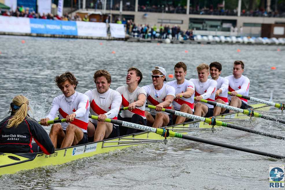 Im Zeitlauf starten die Wittener gut, doch kamen mit dem unruhigen Wasser ab der Streckenhälfte nicht zurecht. Die Folge war der neunte Platz sowie Hürth und Weser-Hameln als Gegner fürs Achtelfinale. Hier lag der RCW-Achter bis zum Endspurt gleichauf mit den Hamelern, doch: „Am Ende wurden wir sehr unsauber und haben uns selbst gebremst. Da konnten wir im Endspurt nicht mit den anderen mitziehen.“, kommentiert Club-Vorsitzender Maik Swienty das Rennen. Damit war die Chance auf die Top vier vertan, doch es galt nun weiter wichtige Punkte einzufahren. Mit diesem Gedanken schoss der RCW-Achter beim Viertelfinale dann förmlich aus den Startblöcken und konnte sich von Anfang an vor die Boote aus Bernburg und Hannover legen. Unter den Anfeuerungen von Lorena Moll konnte die Mannschaft diesen Vorsprung souverän halten und fuhr als erster durchs Ziel.