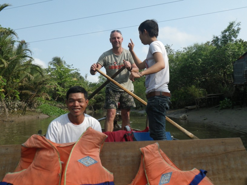 ,,Ruhig den Körper nach vorne! Die Hände eng beieinander!“ Ziemlich bekannt kommen mir die Korrekturen unserer vietnamesischen Begleiterin vor. Das Ganze erscheint mir ein wenig übertrieben, da mir die Technik doch ziemlich einfach erscheint. Ein bisschen wie Streichen, nur leichter. Ich stehe auf dem Heck des flachbodigen Ruderbootes (,,Sampan“ heißen die hier) und rudere uns vorwärts, also Gesicht voraus über einen ruhigen Nebenarm des Mekong. Am Ufer stehen Kokospalmen und Jackfruitbäume, alles in den heftigsten Grüntönen, im Uferschlamm krabbeln Schlammspringer (eine amphibische Fischart), auf der Uferstaße spielen Kinder. In aller Frühe haben wir mit diesem Boot bereits einen der schwimmenden Märkte auf dem Mekong besucht, ich rudere uns jetzt zu einer Reisnudelfabrik zum Mitmachen.