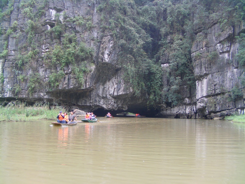 Nur ein paar Tage vorher ging’s mit dem Ruderboot schon durch die trockene Ha Long-Bucht. Genau so ein Naturwunder wie die weltbekannte, 100 km entfernte, nasse Version, stehen die Karstberge hier nicht im Wasser, sondern inmitten knallgrüner Reisfelder, aus denen sie einige hundert Meter steil aufragen. Unsere Strecke führt uns mitten durch die Reisfelder, aber nicht um die Berge herum, sondern mitten darunter hindurch. Richtig gelesen! Der Fluss durchquert mehrere Berge in niedrigen, aber ruderbaren Grotten. Kein Wunder, dass wir an solch einer Touristen-Attraktion nicht alleine teilnehmen.