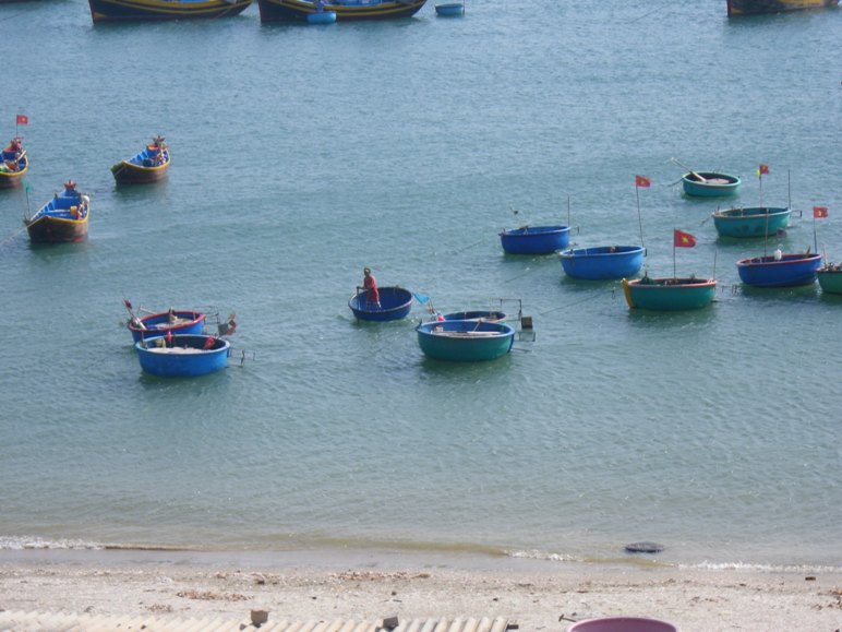 Auf unserer Fahrt gen Süden kommen wir in ein Küstenörtchen, das für seine Dünenlandschaften und den Wind bekannt ist. Im Hafen bietet sich eine Szenerie, die sich durch dutzende kleiner runder Korbboote (Durchmesser ca. 2,5 m) auszeichnet. Der einzelne Riemen hat hier etwa die Form und Größe eines Spatens und ist wieder mit einem Hanfseil an den Dollenstift