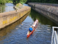 Der folgende Rudertag, Freitag, sollte für uns noch gemäßigte Temperaturen bieten. Der Tross bediente wie üblich die Schleusen, sofern er sie denn fand. Schleusen an solch kleinen Flüssen, erbaut vor knapp 200 Jahren, haben Handbetrieb ohne jegliche elektrische Regelung. Die Fall-/Hubhöhe ist in der Regel nicht mehr als 3 m. Das Regeln übernimmt hier das Wasser selbst: Hat die Kammer noch zu viel Wasser, lassen sich die Tore nicht öffnen. Kann also nix passieren. Ist das untere Schütz nicht richtig zu, wird die Kammer nie voll, respektive leer, wenn das obere Schütz nicht zu ist. Schütz öffnen oder schließen = richtig herum kurbeln und zwar mit einigem Krafteinsatz. Learning by doing und hingucken, ob die Kammer sich wirklich füllt oder leert. Auch Öffnen und Schließen der Tore geht mit Handkurbel. Und ich sachet Euch: Die haben mehr Wasserverdrängung als ein Scullblatt.