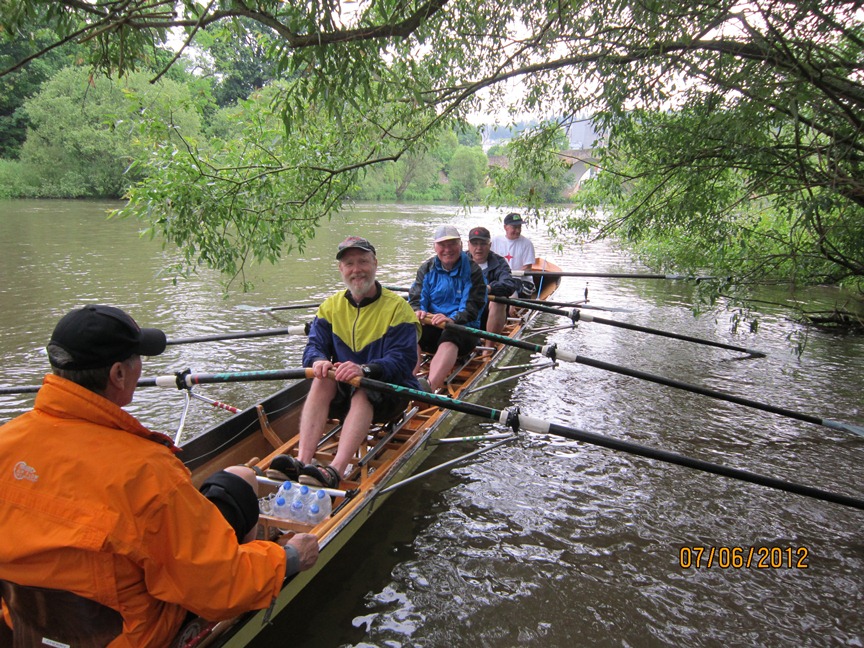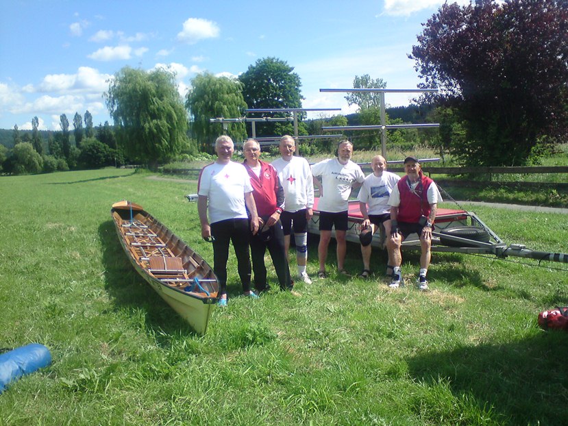 Sonntag, letzter Tag: Mit gutem Wind und guter Strömung galt es, die letzte Etappe bis Mittag zu rudern. Langsam wurde der Himmel wolkenverhangen, Schlechtwetter kündigte sich an. Anlegen an geplanter Stelle, das Boot aus dem Wasser heben, abriggern, verladen und dann einen zufällig vorbeikommenden Rentner dazu animieren, dass er das obligatorische Gruppenfoto von uns macht. Noch ein (Weiß)bier und eine Suppe auf der Terrasse des Fähr-Hotels „Zum Anker“. Bald nach Mittag traten wir dann zufrieden über diese harmonische Fahrt die Heimreise nach Witten an.