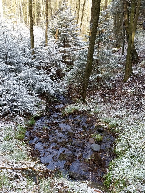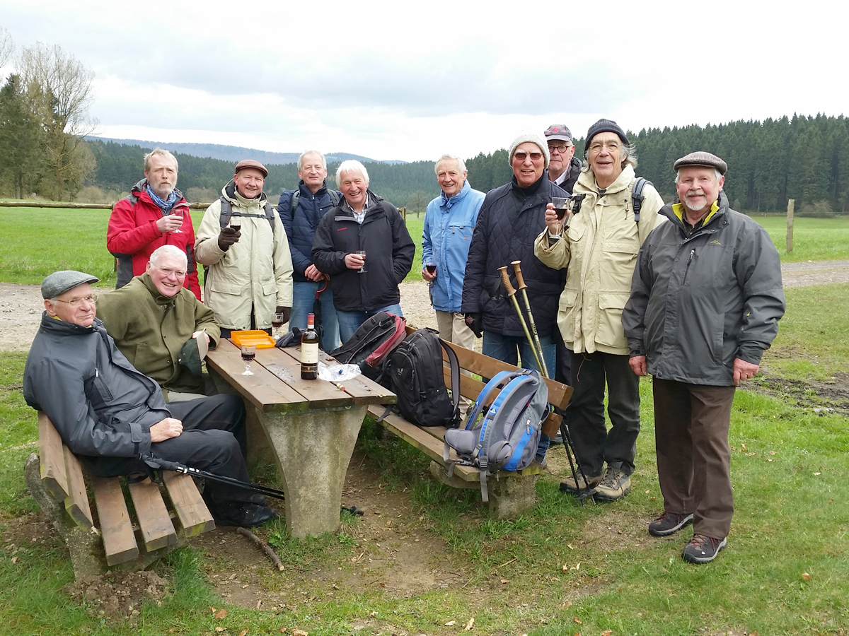 Mit allem Wetter- und Wandernotwendigem versehen, trafen sich die wanderwilligen Donnerstag-Stammtischbrüder am Samstagmorgen, den 23.4. zur Abfahrt zum Veischeder Sonnenpfad im Naturpark Ebbegebirge, zwischen 300 und 600 m hoch gelegen. Der Frühling hinkte hier noch mindestens drei Wochen hinter Witten her. Doch, dem Wieder-Wintereinbruch zum Trotz, unser WaRuWa Dieter hatte vorgesorgt. Nicht nur das Nachtquartier für die kommende Nacht war bestellt, nein auch eine wärmende Mittagssuppe für den ersten Tag.